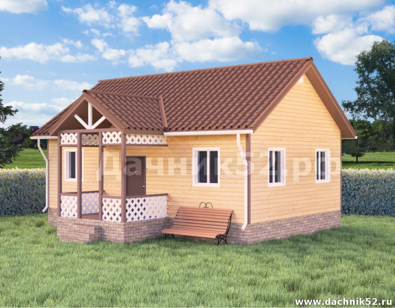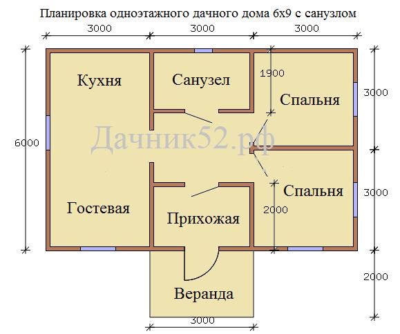 Помещения: веранда, прихожая, холл, санузел, две спальни, кухня, гостиная.
