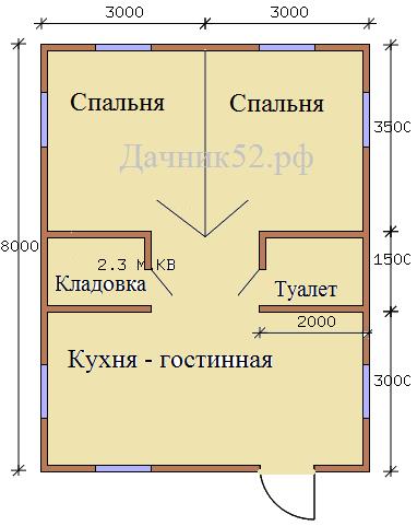 Помещения: санузел, кладовка, две спальни, кухня - гостиная
