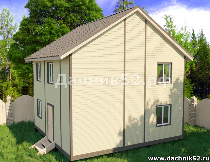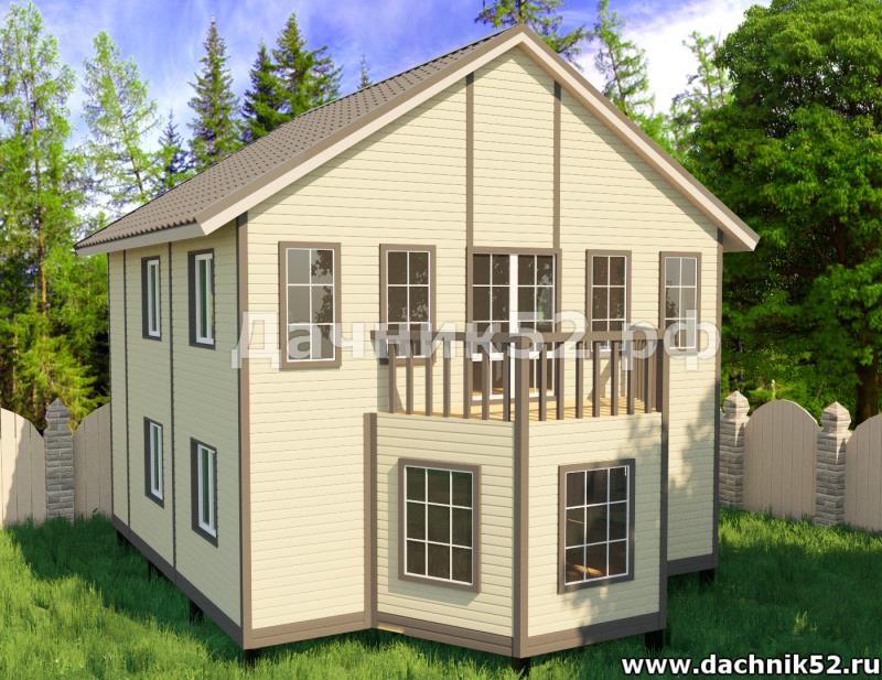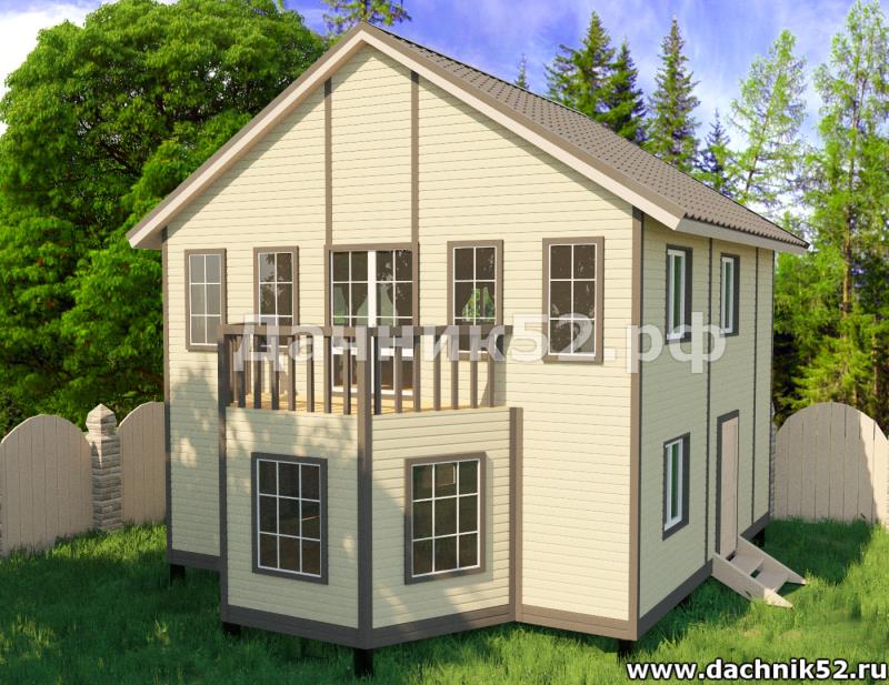 Каркасный двухэтажный дом, с балконом. На балконе распашная дверь. Окна со шпросами. В доме удобная планировка. Лестница двухмаршевая.