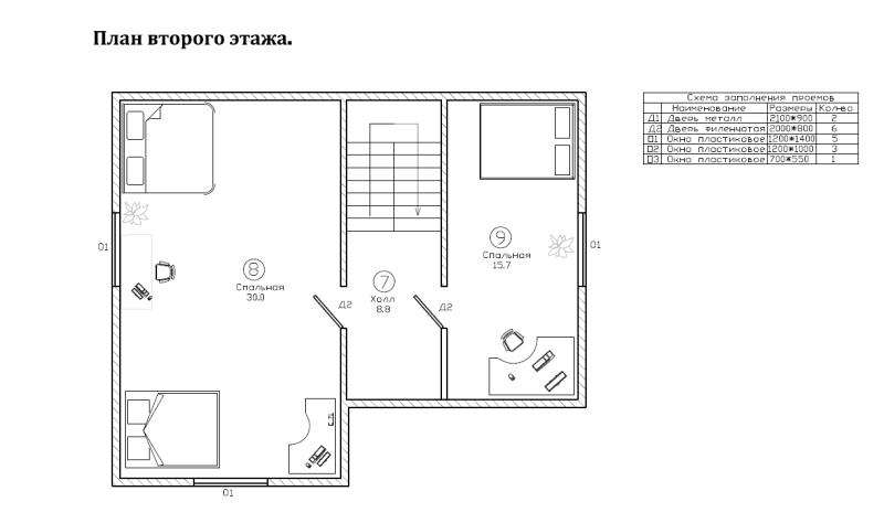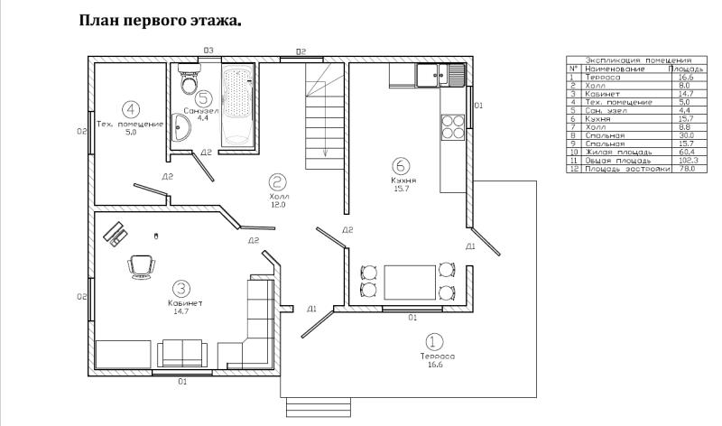 Помещения: кухня, кабинет, санузел, бойлерная, холл, две спальни