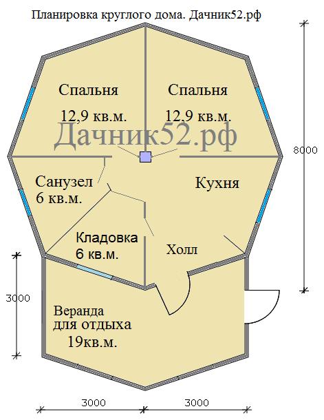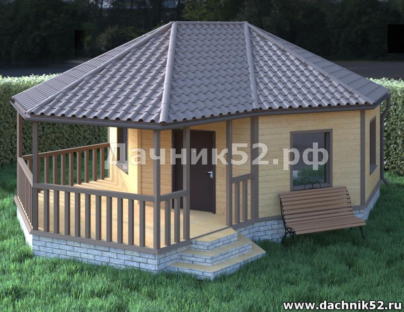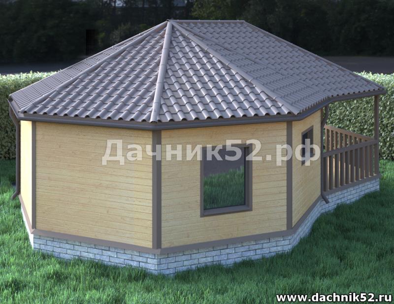 Круглый дом с террасой открытой, для летних посиделок на свежем воздухе. Интересный проект круглого дома. В доме две спальни, санузел, кухня, кладовая комната, холл и открытая терраса. Круглые каркасные дома отличаются от классических дачных домов. Стоимость круглого дома уточняйте у нас по телефону. Сборка дома бесплатная на участке заказчика.