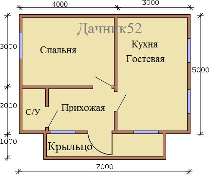 Проект одноэтажного каркасного дома 5х7 с крыльцом. Закажите зимний дачный домик 5х7 с печкой, тогда можно пользоваться домом в холода.