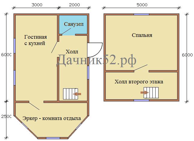 Помещения: прихожая, санузел, кухня гостиная, спальня, холл, комната отдыха в эркере