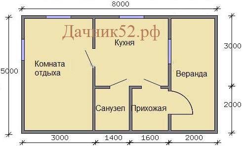 Помещения: прихожая, санузел, кухня, спальня, веранда.