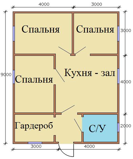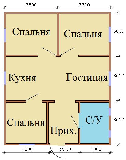 Помещения: прихожая, гардероб, санузел, три спальни, кухня - гостиная