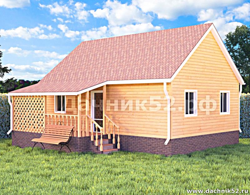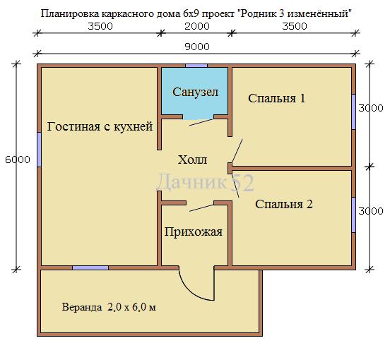 Одноэтажный каркасный дом 6 х 9 с верандой проект Родник 3 изменённый.