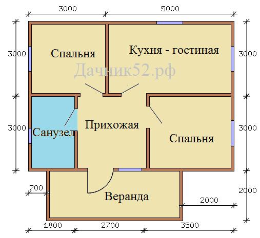 Помещения: веранда, две спальни, прихожая, санузел, кухня - гостиная.