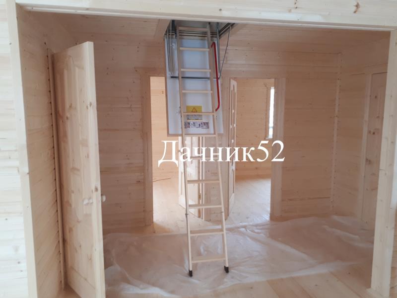 Каркасный дом 8 х 8 с мансардой и чердачной лестницей. Если вам не нужна стационарная лестница, то этот вариант дома для вас. Складная чердачная лестница экономит место на первом этаже.