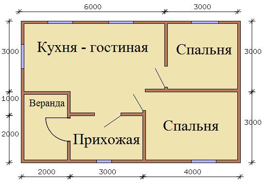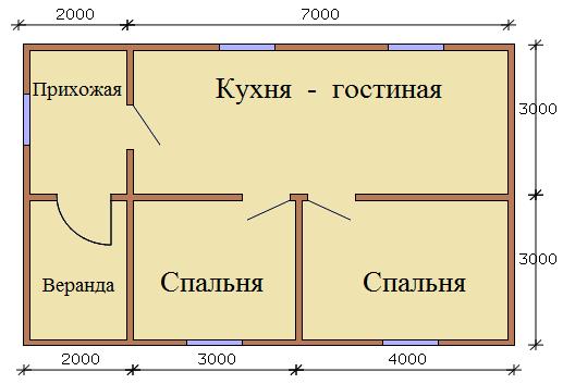 Помещения: веранда, две спальни, кухня, гостиная, прихожая.