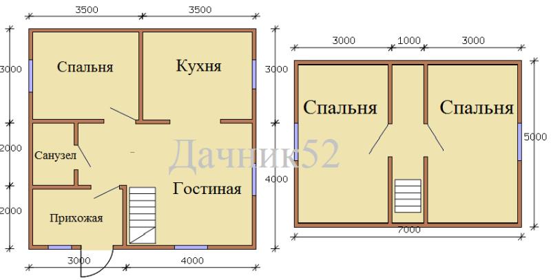 Классический вариант дома 7 на 7 с мансардой для дачи проект Аист 17. Дом с тремя спальнями и просторной гостиной.