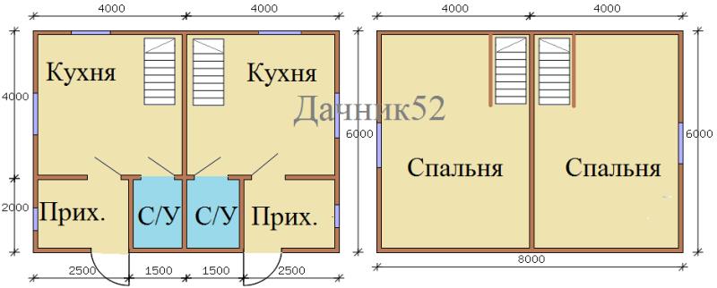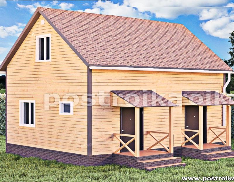 Проект каркасного дачного дуплекса, дом на две семьи размером 6 на 8 в полтора этажа.