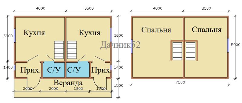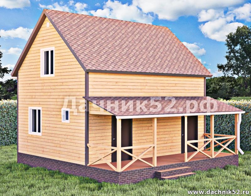 Недорогой проект каркасного дачного дуплекса, дом на две семьи с общей верандой. В этом дуплексе одна половина немного больше чем другая. Смотрите планировку дуплекса.