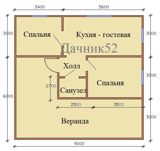 Помещения: веранда, санузел, две спальни, кухня, гостиная, холл.