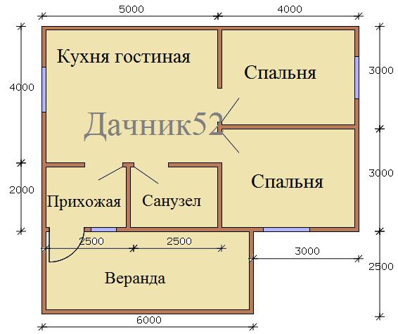 Помещения: веранда, санузел, две спальни, кухня - гостиная, прихожая