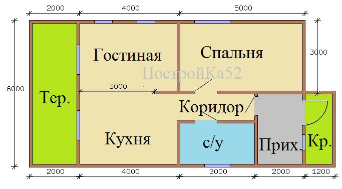 Помещения: терраса, санузел, спальня, кухня, гостиная, прихожая, крыльцо.