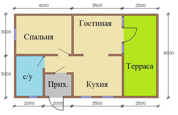 Помещения: терраса, санузел, спальня, кухня, гостиная, прихожая, крыльцо.