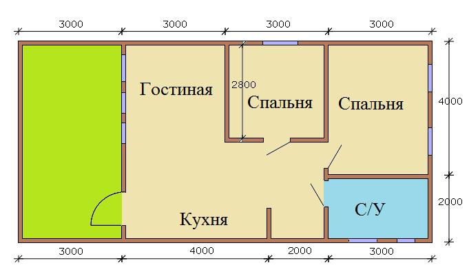 Помещения: терраса, санузел, две спальни, кухня, гостиная.