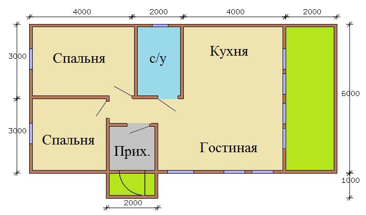 Помещения: терраса, санузел, две спальни, кухня, гостиная.
