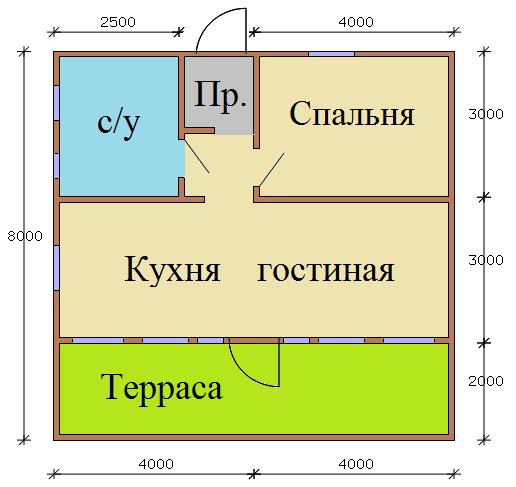 Помещения: терраса, санузел, спальяня, кухня, гостиная, прихожая.